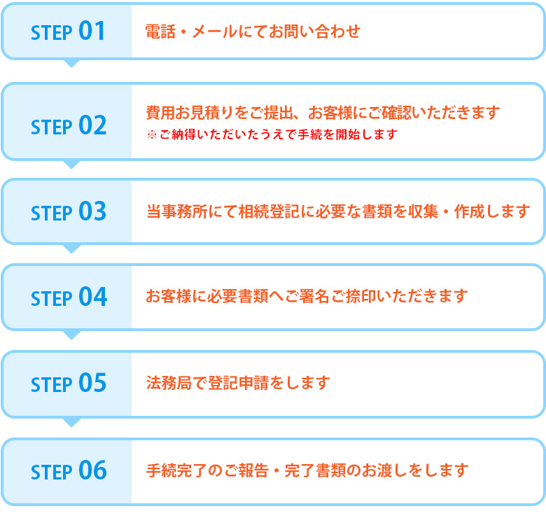 - 法務局に登記申請書を提出してから登記が完了するまでは約1週間から10日程です。ただし、相続登記では用意しなければならない書類が多かったり、相続の方法によっては事前の手続きが必要になったりしますから、登記申請前にかなりの準備時間を要します。相続が発生したらできるだけ早く準備に取りかかる必要がありますので、お早めにご連絡ください。